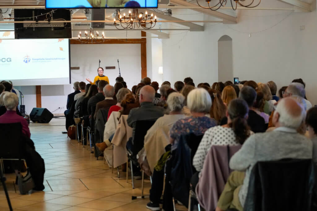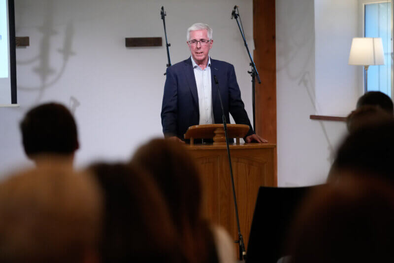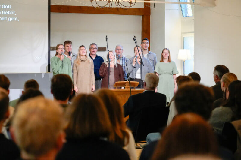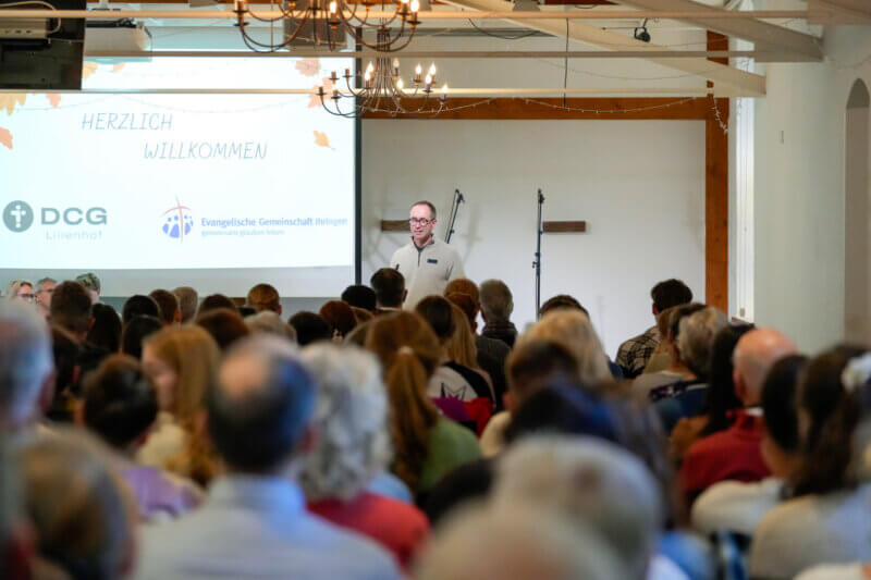 Im Saal begrüßte Vorsteher Max Meier anschließend alle ca. 200 Teilnehmer des Gottesdienstes und freute sich darüber, Glaubensgeschwister aus unmittelbarer Nähe hier zu haben. Nach dem Gebet klärte Pascal Wissler über die Lieder der DCG auf und teilte etwas zur Historie und Verfasser mit.