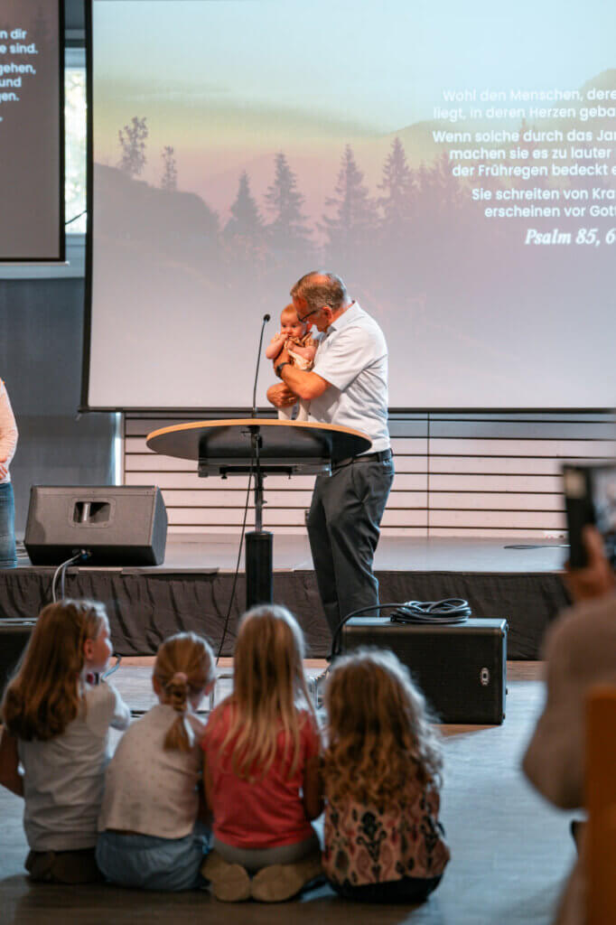 Im Rahmen der Kindersegnung hob Vorsteher Samuel Seiter den Wert der Kinder hervor: „Sie sind ein Stück vom Himmel!“ Und sie sollen bei uns ebenfalls das Himmelreich erleben dürfen: Dieses Reich zeigt sich in Liebe, Dankbarkeit, Gerechtigkeit, Frieden und Freude – Werte, die Kindern Geborgenheit geben. „Wenn sie Liebe und Dankbarkeit zuhause erleben, dann können sie gedeihen“, so Seiter.