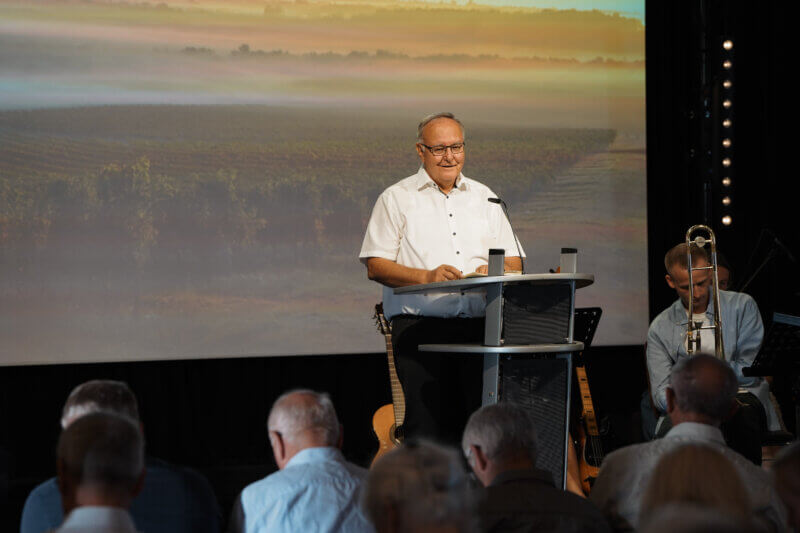 Der Tag begann mit einem festlichen Gottesdienst. Vorsteher Christoph Matulke stellte die Worte Jesu aus Johannes 14,21 in den Mittelpunkt: „Wer meine Gebote hat und hält sie, der ist es, der mich liebt“. Solo- und Chorgesang sowie ein passender Videobeitrag gestalteten den Gottesdienst.